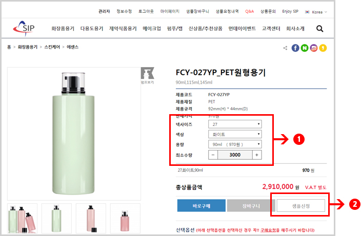 - 3. 제품상세페이지에서1옵션사양을 선택해 주시고,2샘플신청버튼을 눌러 주시면 됩니다.