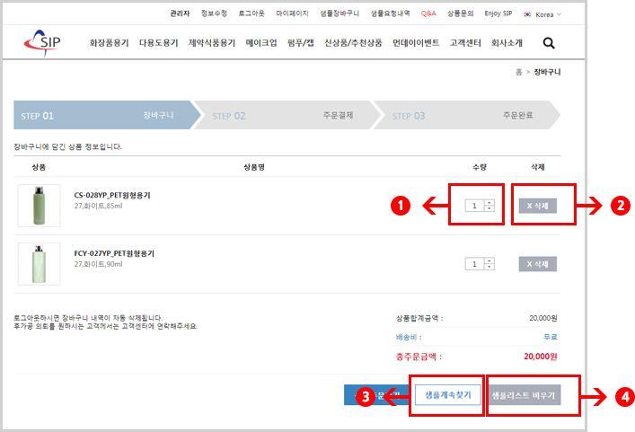1샘플장바구니화면에서 원하시는 샘플의 수량을 선택해 주세요.
