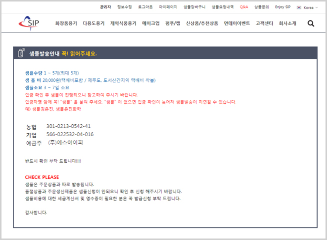 입금이 확인된 후 샘플발송처리가 진행됩니다.