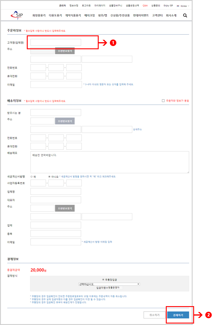 1입금자명란에 입금자명을 기입해 주세요. 기입하실때 입금자명 앞에 꼭 “샘플” 이라고 써 주셔야 샘플이 빠르게 처리됩니다. (예 : 샘플이은진)